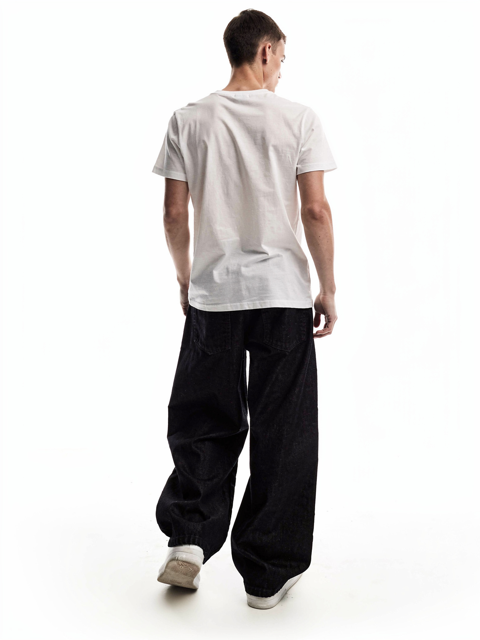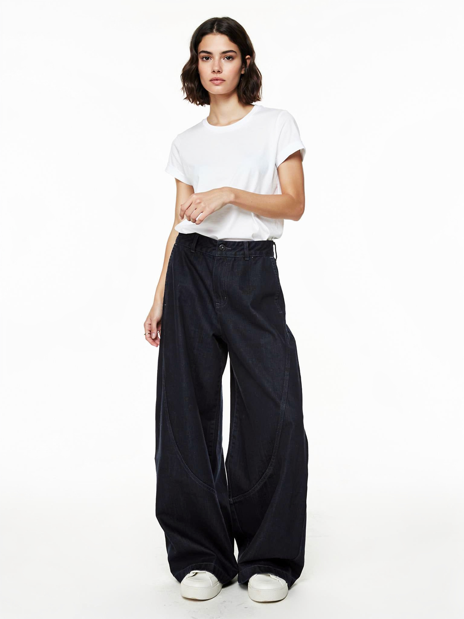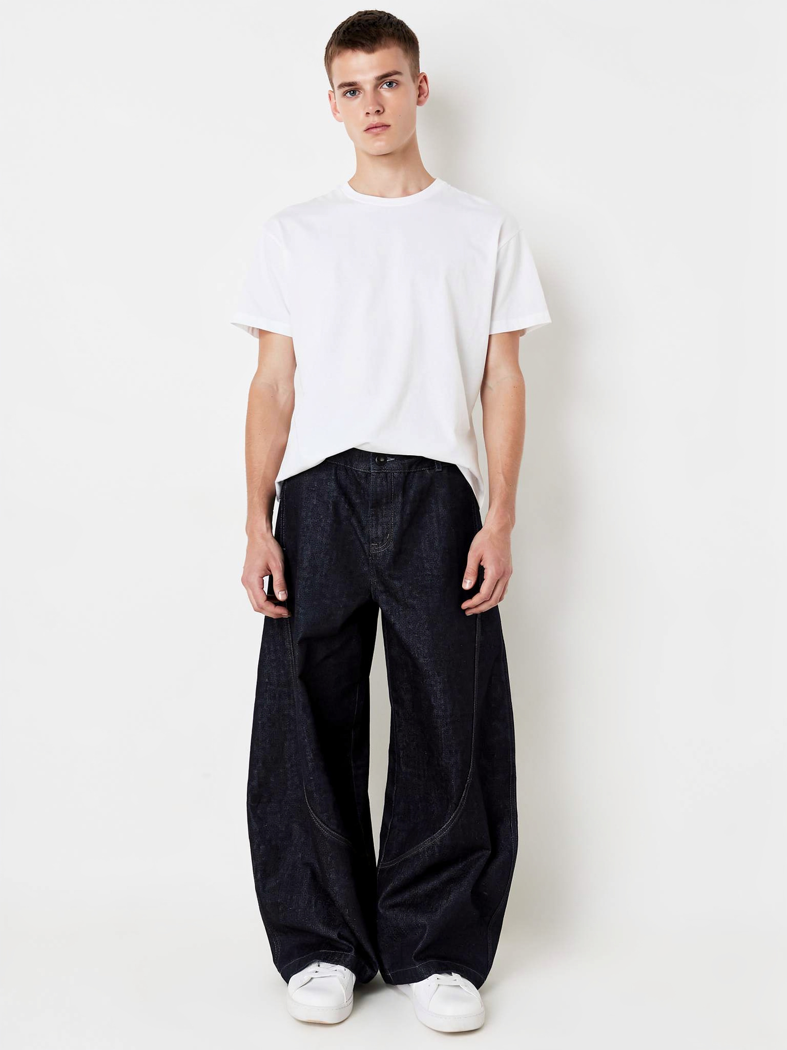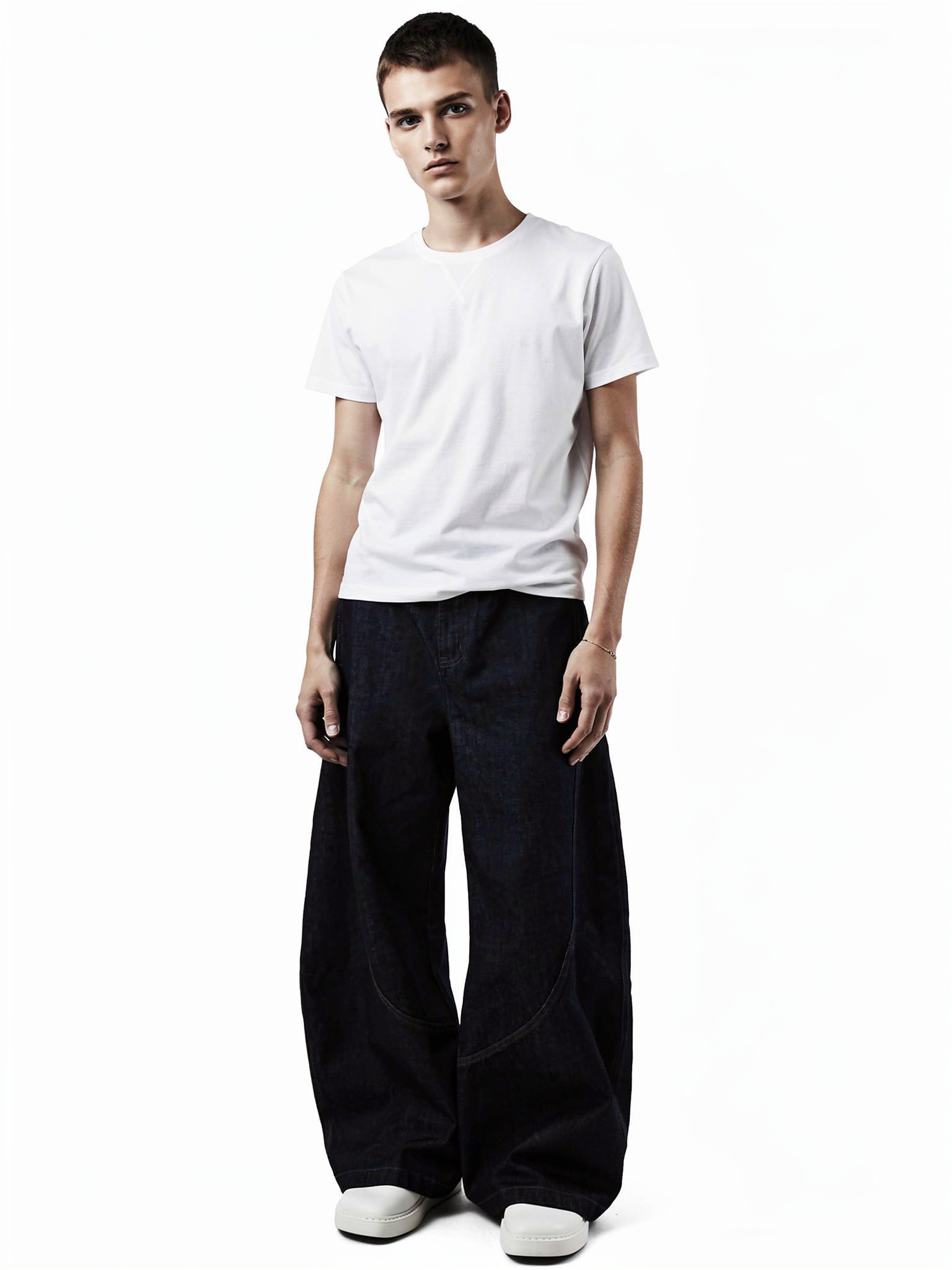 - クリーンな白シャツ:インディゴの濃紺を活かした大人なモードスタイル