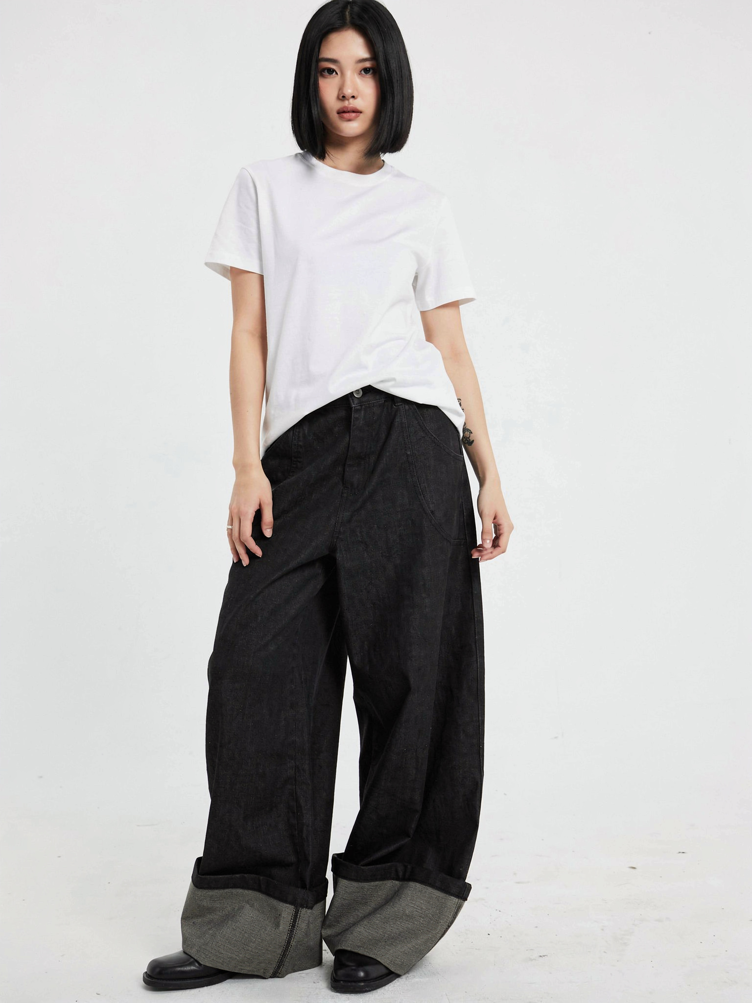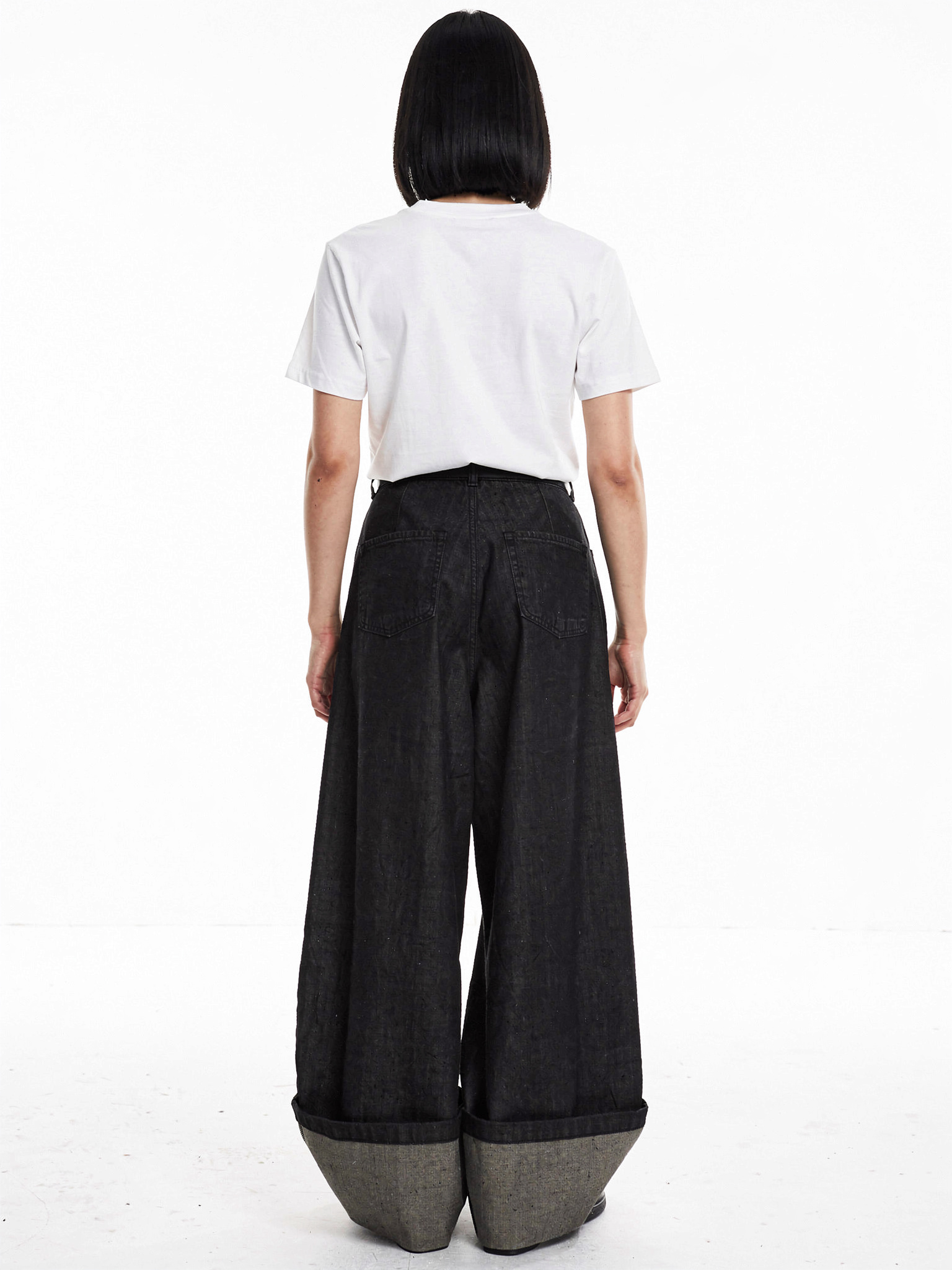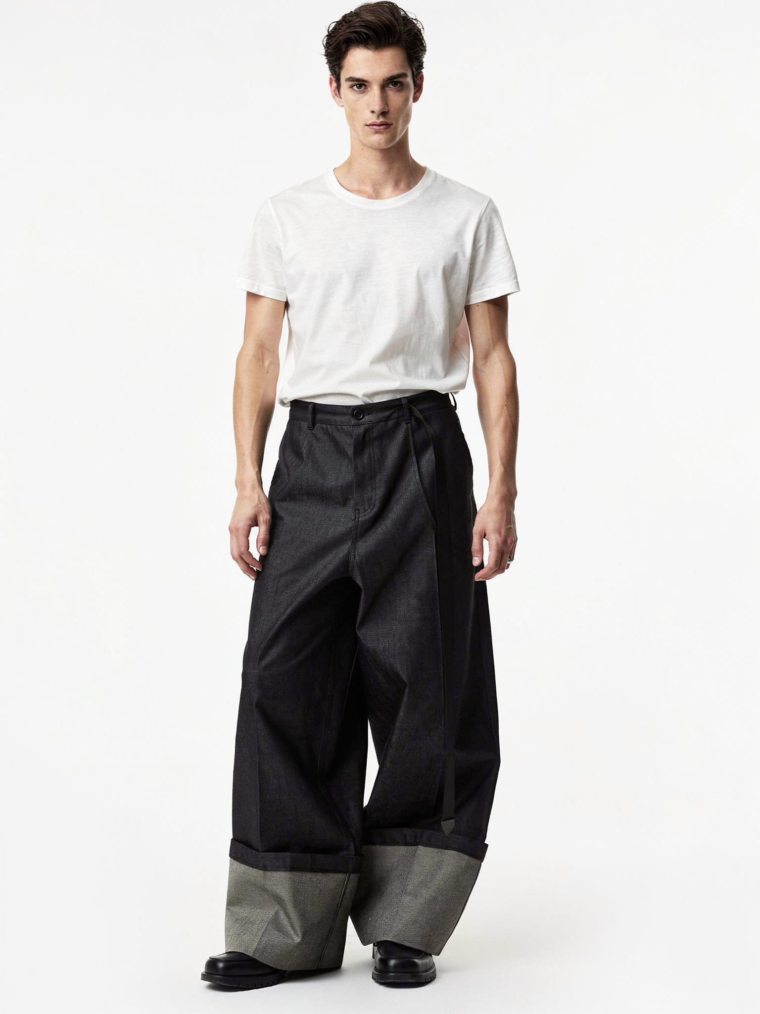 独創的な「ワイドロールアップ」デザイン 裾に施された大胆な幅広ロールアップ設計が最大の特徴。足元に圧倒的な視覚的インパクトを与え、どんなシューズと合わせてもこなれたバランスを構築します。