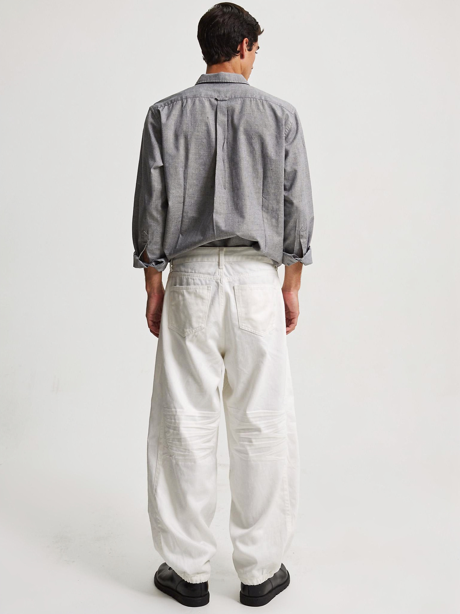 - オーバーサイズシャツ:素材のハリ感を活かした都会的なクリーンバギー