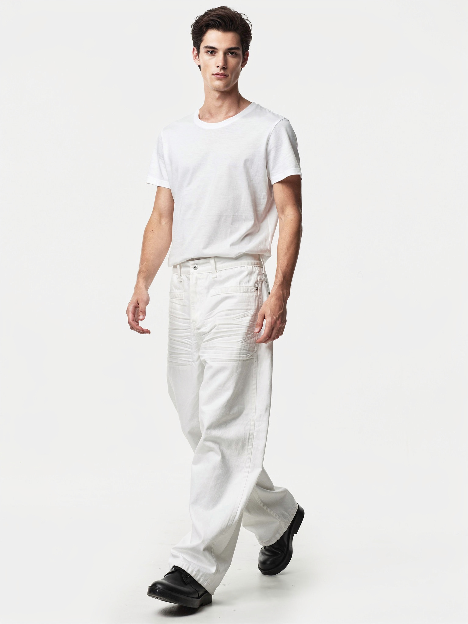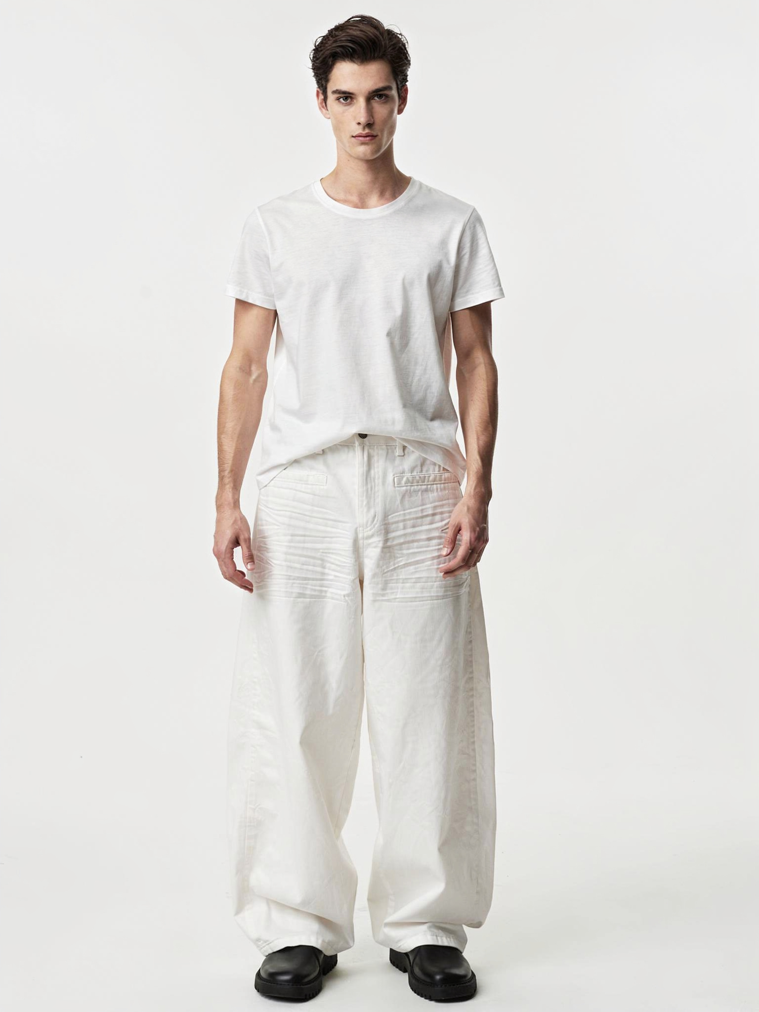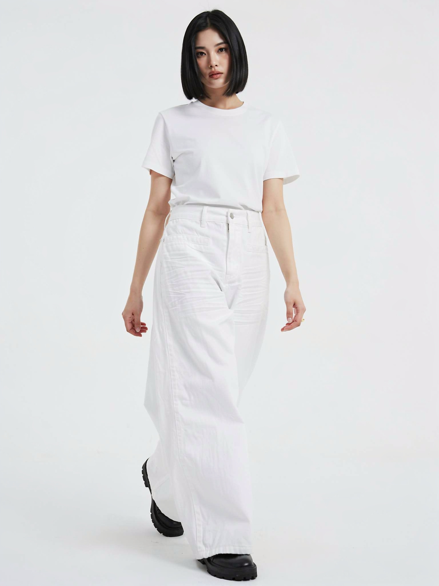 - タイトなブラックTee:白のボリュームを際立たせるミニマル・モノトーン